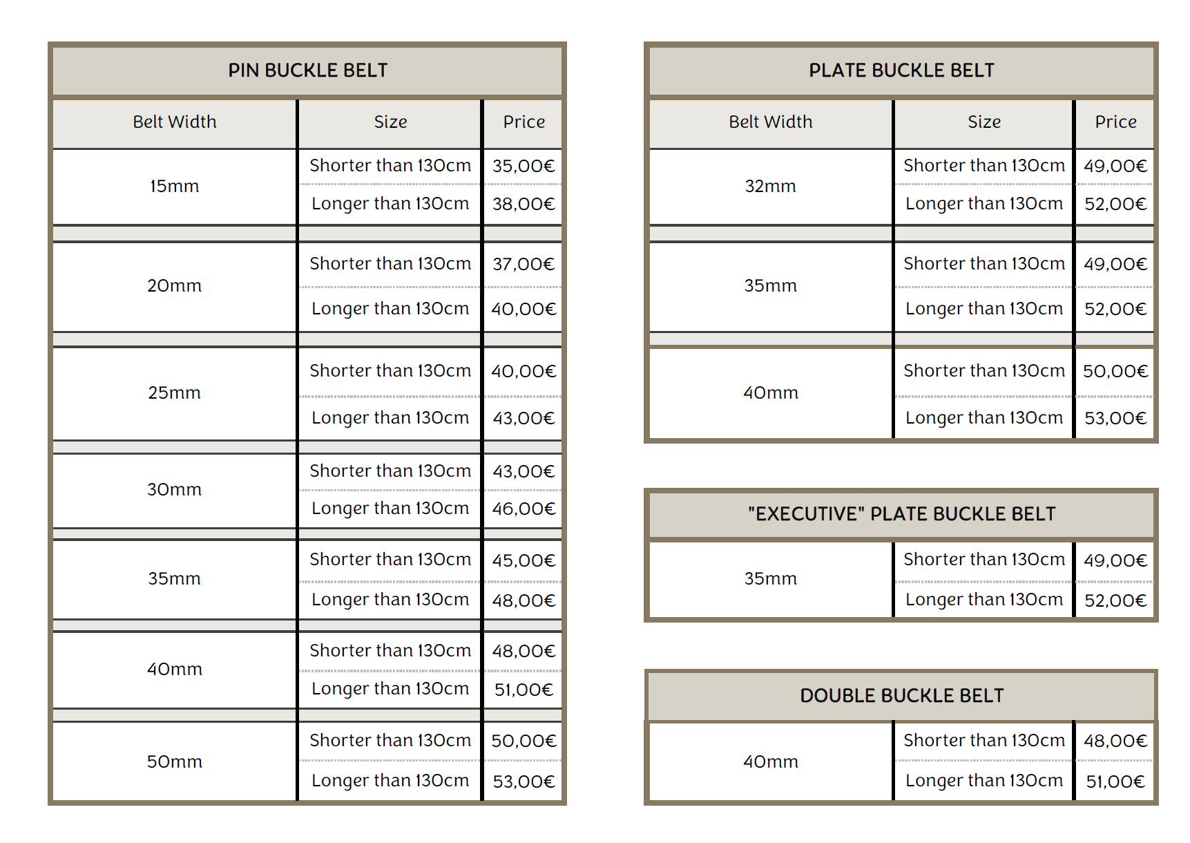 Any belt longer than 130cm is considered an extra-large size, which comes with a slight increase in the pricing. Do not hesitate to ask for further information.